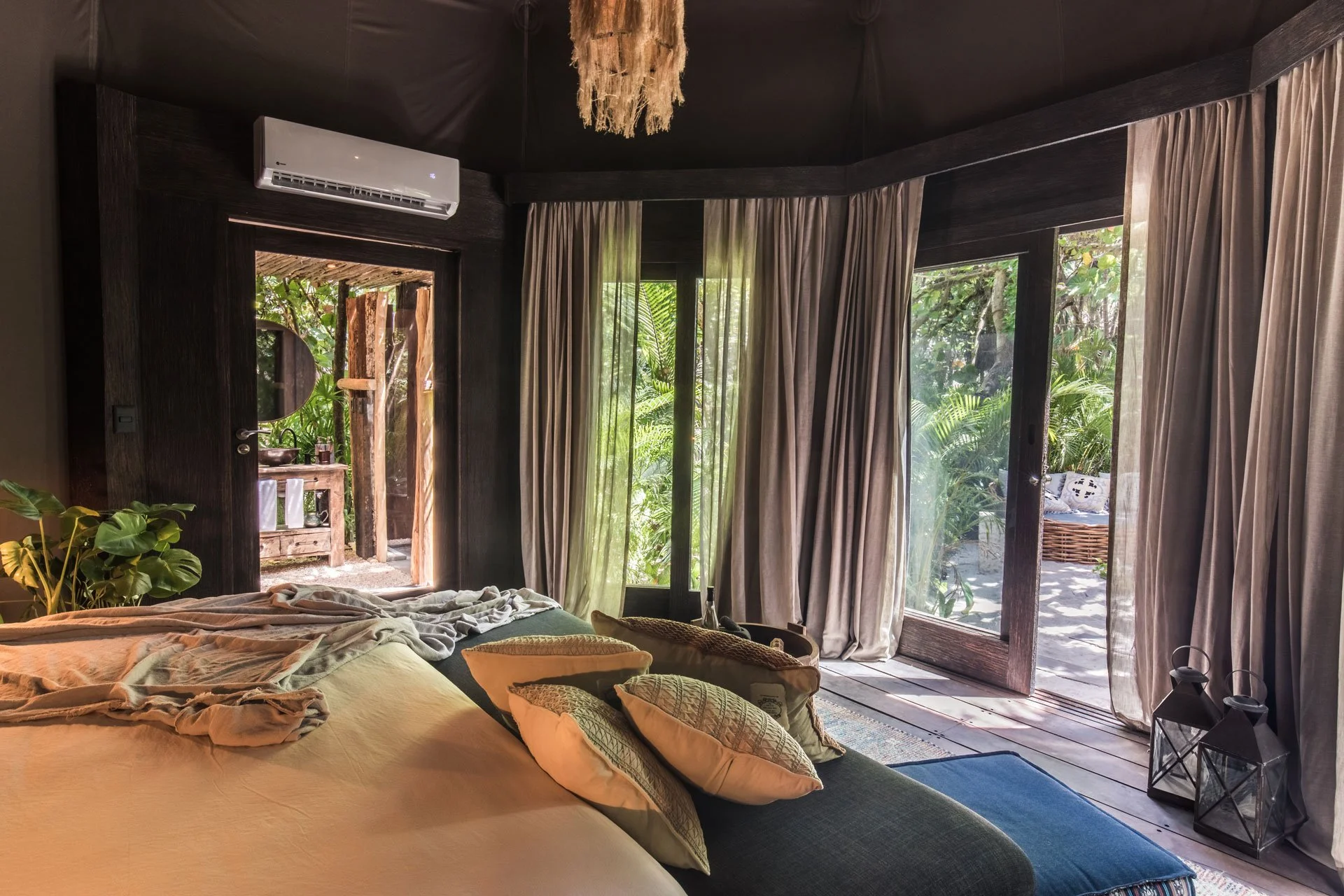 This room is a shared room for 3 travelers. This is all out luxury with one bedroom and one additional canopy covered bed, sandy outdoor living space, and PRIVATE POOL!! Say whaaat?! You’ll never be more than a few steps away from paradise in this Tulum Oasis. (1 suite available-you can choose your roommates or we can help)